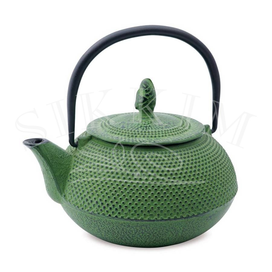 - Ciężki i solidny czajnik z żeliwa, wewnątrz emaliowany, sprzedawany wraz z metalowym sitkiem do parzenia herbaty.