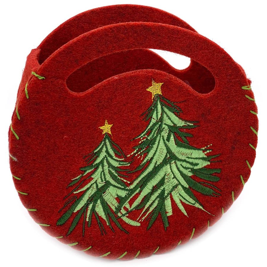 Torebka wykonana z grubego czerwonego filcu z haftem przedstawiającym choinki. Średnica około 15cm, głębokość około 8 cm.