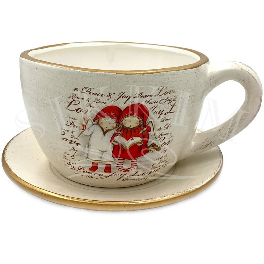 Ręcznie malowana, olbrzymia filiżanka ze stylowym wizerunkiem dzieci przebranych w stroje Mikołaja, która jest przedmiotem dekoracyjnym, a nie użytkowym. Może służyć jako pojemnik na drobiazgi, opakowanie na Twój herbaciany prezent lub po prostu jako osłonka do kwiatka. Wykonana ze matowej ceramiki o wymiarach około 15cm średnicy naczynia w górnym miejscu, średnica spodka około 18cm, wysokość całości 11cm.