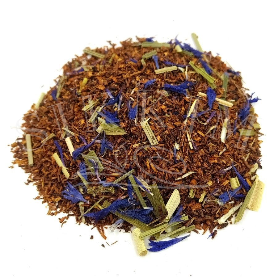 Herbatka Rooibos o cytrusowym aromacie, z trawą cytrynową, nasionami kakaowca oraz kwiatem bławatka.