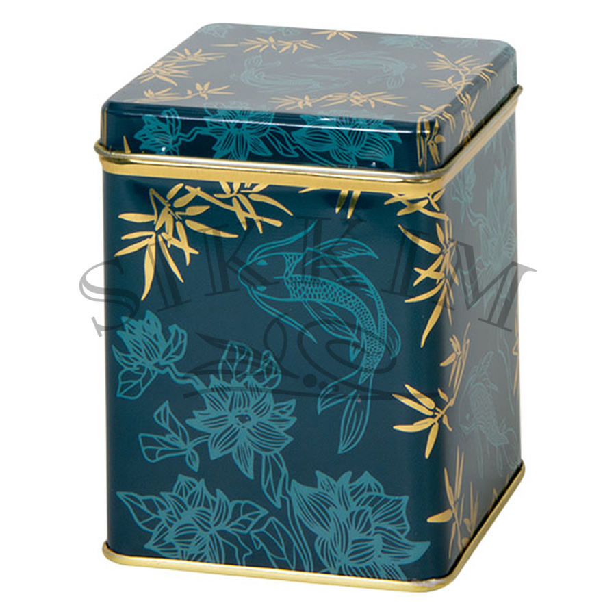 Piękna i szczelna puszka ze szmaragdowym tłem i złotym orientalnym wzorem roślinnym. Wciskana przykrywką dokładnie licuje się z bokiem pojemniczka. Przeznaczona jest na około 100 gramów produktu i posiada wymiary 75x75mm w podstawie oraz 95mm wysokości. Jako osobny produkt sprzedajemy również podobną, większą puszkę na 50g herbaty.