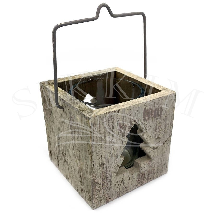 Drewniany świecznik z wyciętym motywem choinki, który udekoruje Twój dom w okresie świąt i zimowej pory roku. Wewnątrz znajduje się szklany wkład, do którego wsadzamy świeczkę typu tea-light. Dekoracja posiada również metalowe ucho do powieszenia. Wymiary około 8x8x8cm a wysokość wraz z uchwytem 16cm.