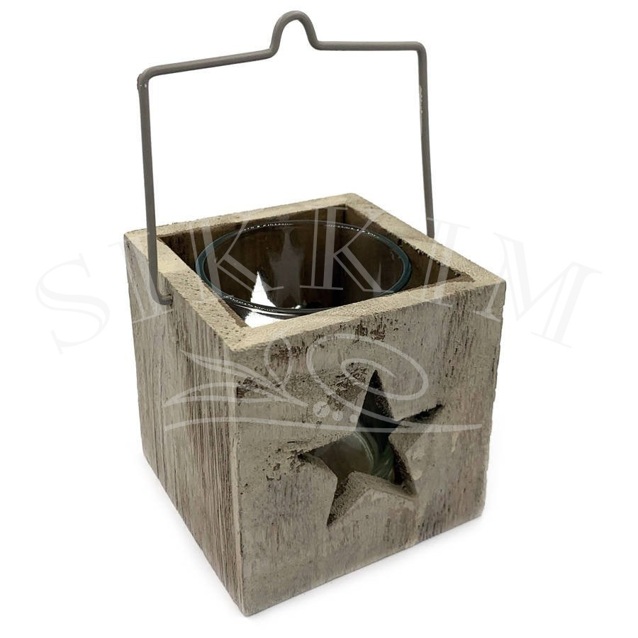 Drewniany świecznik z wyciętym motywem gwiazdki, który udekoruje Twój dom w okresie świąt i zimowej pory roku. Wewnątrz znajduje się szklany wkład, do którego wsadzamy świeczkę typu tea-light. Dekoracja posiada również metalowe ucho do powieszenia. Wymiary około 8x8x8cm a wysokość wraz z uchwytem 16cm.