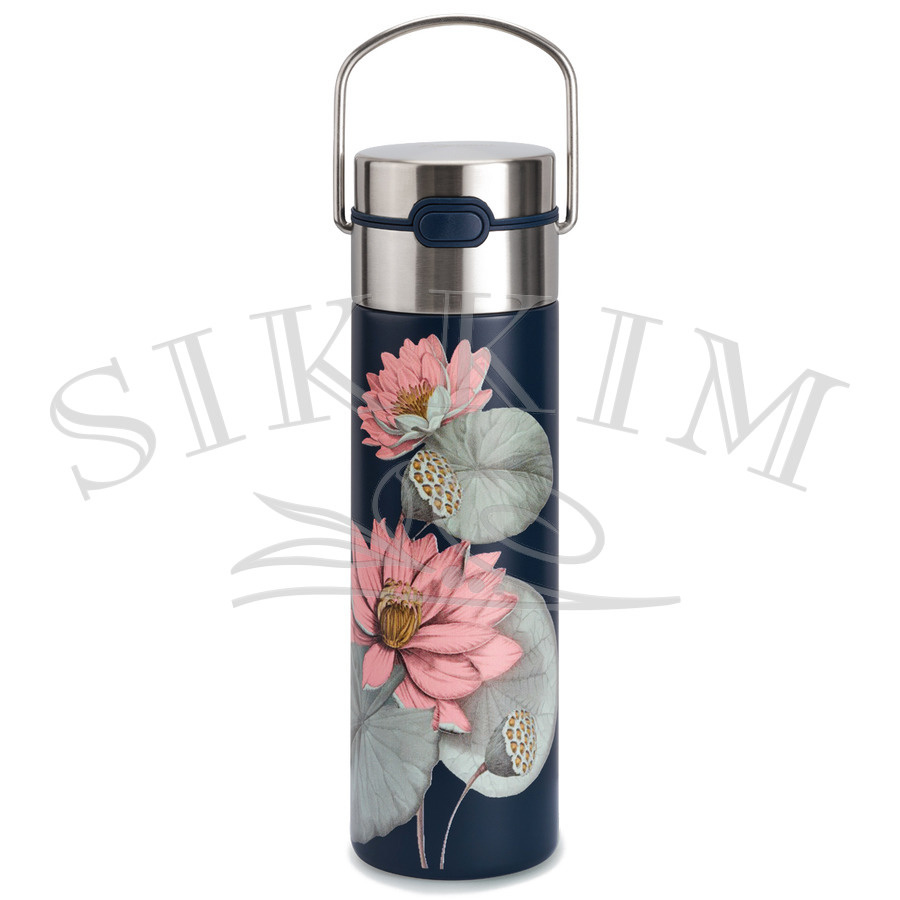 Motyw zdobiący stalowy termos jest nowoczesny i chwytający oko. Wpisuje się on w stylistykę pozostałych przedmiotów stanowiących kolekcję, jak na przykład kubki, czy metalowe puszki. W tym modelu przestawia on różowy kwiat lotosu na czarnym tle. Urządzenie ma 23,5cm całkowitej wysokości (bez ruchomej rączki) i 7cm średnicy.