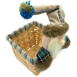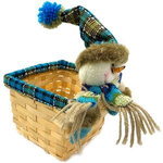 Wiklinowy koszyk obszyty materiałem z przytwierdzoną dekoracją szmacianego bałwanka. Ciekawy dodatek do zapakowania Twojego bożonarodzeniowego prezentu.
