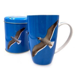 Zestaw składający się z porcelanowego kubka i metalowej puszki na herbatę, które są ze wspólnym wzorem przedstawiającym mewę na błękitnym tle nieba.