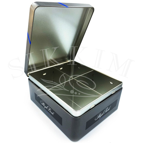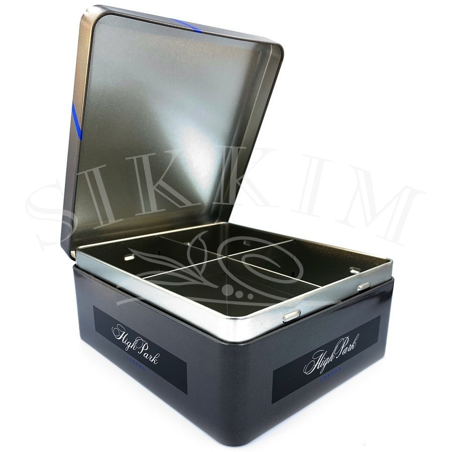 Ekskluzywny puszka z zamknięciem na zawiasie, która posiada przegródki na 4 rodzaje saszetek z herbatą. High Park to ekskluzywna marka z Londynu dbająca o najdrobniejszy detal i jakość. Wymiary zewnętrzne pudełka to 15,5cm * 13,5 cm oraz 6,5cm wysokości.