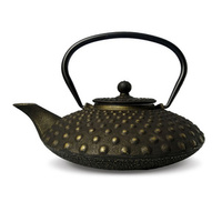 Ciężki i solidny czajnik z żeliwa, wewnątrz emaliowany, sprzedawany wraz z metalowym sitkiem do parzenia herbaty.