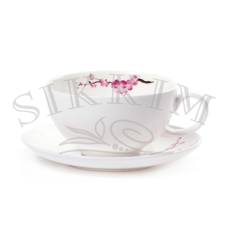 - Filiżanka o pojemności 200ml wraz ze spodkiem z delikatną dekoracją przedstawia modny wzór gałązek kwitnącej wiśni umieszczona od wewnętrznej strony naczynia oraz na spodku.