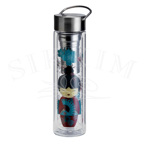 - Szklana dwupłaszczyznowa butelka do zaparzania herbaty lub po prostu na wodę, z piękną dekoracją umieszczoną na wewnętrznej warstwie, sprzedawana z neoprenowym ocieplaczem.