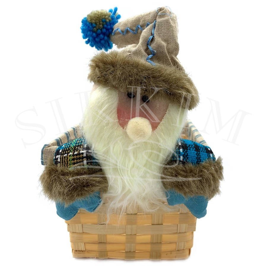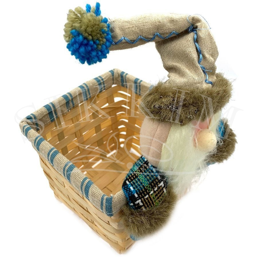 - Wiklinowy koszyk obszyty materiałem z przytwierdzoną dekoracją szmacianego bałwanka. Ciekawy dodatek do zapakowania Twojego bożonarodzeniowego prezentu.