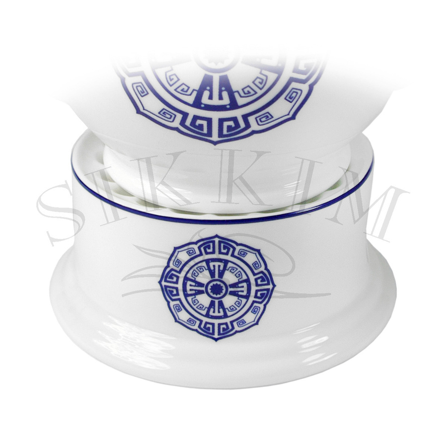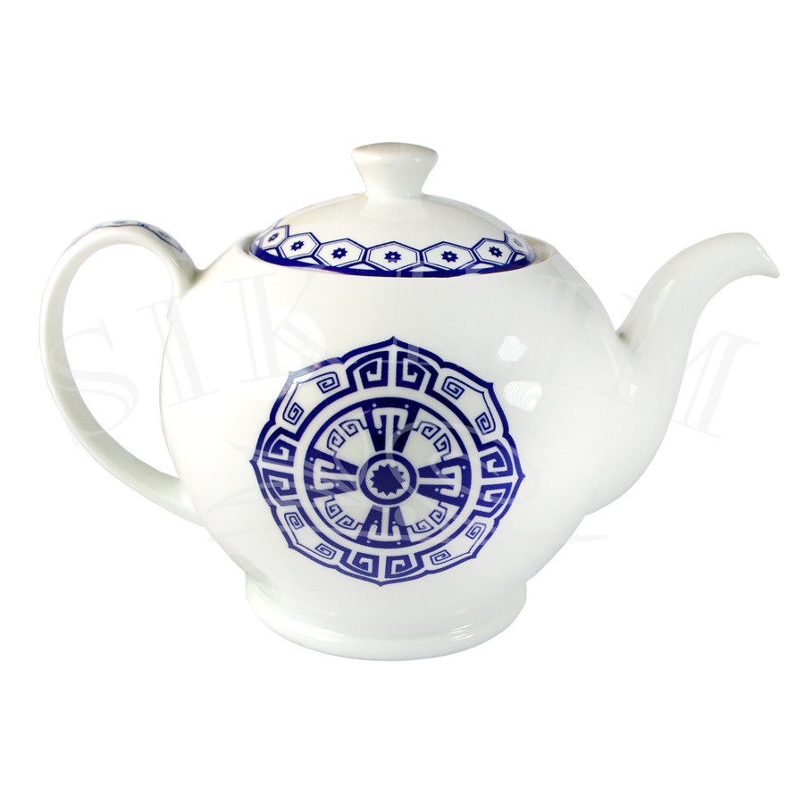 Doskonałej jakości porcelanowy zestaw sygnowany logo niemieckiego producenta `Cliffield Hamburg` składający się z czajnika 1500ml umieszczanego na dopasowanym podgrzewaczu i czterech filiżanek 180ml. Wysokiej jakości porcelana o doskonałej bieli, twarde i trwałe szkliwo gwarantujące długą żywotność i odporność na zużywanie, wszystkie elementy nadające się do zmywania w zmywarkach. Dekoracja przedstawia jednokolorową grafikę przypominającą różę wiatrów. Wysokość czajnika z przykrywką to 145mm, szerokość od rączki do dzióbka 240mm. Średnica podgrzewacza 140mm, wysokość 65mm. Średnica filiżanki 90mm, jej wysokość 50mm, oraz średnica spodka 140mm.