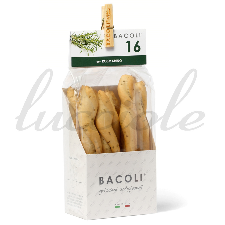 Doskonałej jakości Grissini Artigianali, których delikatna struktura i kruchość dosłownie uzależnia. Włoska klasyka spod ręki mistrzyni cukiernictwa Marty Maristrello, która doprowadziła codzienne przepisy do doskonałości. Oferowane grissini są niebagatelnej grubości, dlatego nazwano je 'Bacoli' od starodawnej nazwy biskupiego kija pasterskiego (baculum - łac.). W tej wersji z pachnącym rozmarynem, wspaniałe jako dodatek do deski serów lub wędlin, popołudniowego aperitivo owinięte plasterkiem szynki parmeńskiej lub salami z Mediolanu. Opakowanie ma kartonowy ekspozytor oraz wewnętrzny rękaw foliowy, który powoduje, że Bacoli są gotowe do eleganckiego serwowania bez przekładania w inne naczynie. Same naturalne składniki: mąka pszenna typu "0", rozmaryn 2%, woda, oliwa z oliwek z pierwszego tłoczenia 4%, sól, oregano 1%, cukier, drożdże.