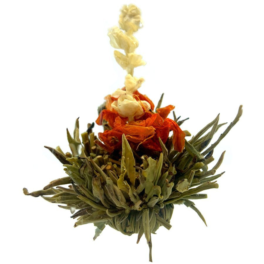 - Młode liście białej herbaty ręcznie zwijane w kulkę wraz z ukrytymi wewnątrz kwiatami lilii i jaśminu. Herbata zjawiskowo rozwija się po zalaniu gorącą wodą tworząc przepiękną kompozycję w filiżance.