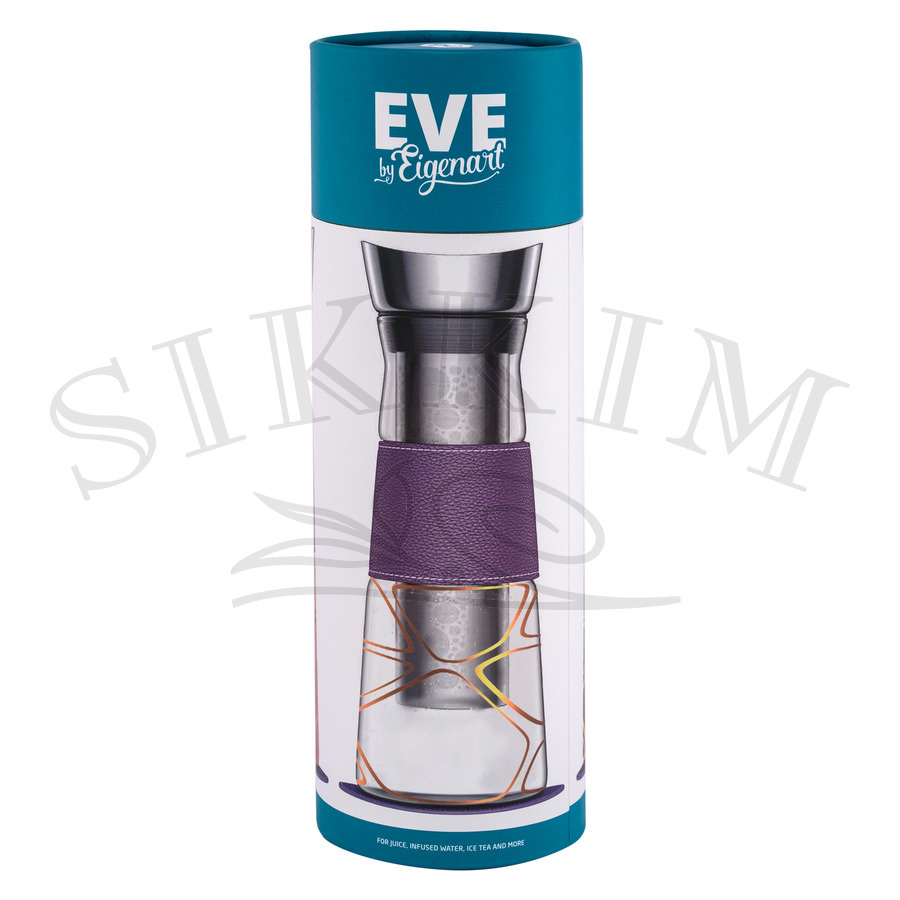 Szklana butelka w kształcie karafki wyposażona w zaparzacz ze stali nierdzewnej, w której możesz zaparzyć swoją ulubioną herbatę, ziołowe mieszanki, rooibosa, mieszankę owocową lub po prostu traktować ją jako karafkę na wodę. Doskonale spisze się również do przygotowania cold-brew, czyli naparów sporządzanych z zimną wodą. Wyposażona jest w zapinaną na rzep osłonkę, która będzie zabezpieczała dłoń w momencie nalewania gorącego naparu. Z tego samego materiału wykonano podkładkę na stół. Górna część wykonana jest ze stali nierdzewnej polerowanej na wysoki połysk, w której znajduje się uchylna klapka, która otworzy się w chwili przechylania naczynia i samoczynnie zamknie gdy odstawimy je na miejsce. Zaparzacz również z wysokiej jakości błyszczącej stali jest trwały, głęboki, posiadający małe oczka przez które nie przedostaną się do herbaty nawet drobne fusy. Jego powierzchnia to unikalny i dekoracyjny wzór. Co więcej - jako opcję można dokupić jako osobne akcesorium wkład do chłodzenia, czyli zamiast zaparzacza do karafki wkładamy stalowy wypełniacz uprzednio schłodzony i wypełniony lodem. W ten sposób możemy mieć litr ulubionej herbaty mrożonej, która zachowa swoją temperaturę przez dłuższy czas.
