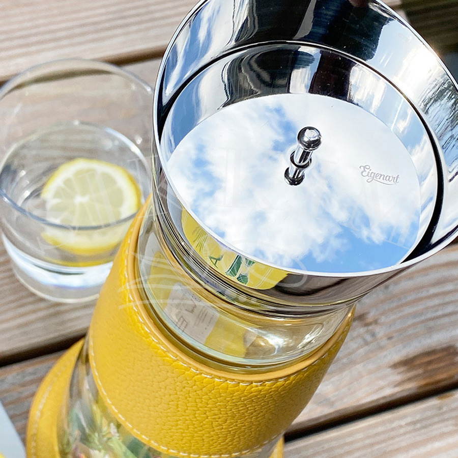 Szklana butelka w kształcie karafki wyposażona w zaparzacz ze stali nierdzewnej, w której możesz zaparzyć swoją ulubioną herbatę, ziołowe mieszanki, rooibosa, mieszankę owocową lub po prostu traktować ją jako karafkę na wodę. Doskonale spisze się również do przygotowania cold-brew, czyli naparów sporządzanych z zimną wodą. Wyposażona jest w zapinaną na rzep osłonkę, która będzie zabezpieczała dłoń w momencie nalewania gorącego naparu. Z tego samego materiału wykonano podkładkę na stół. Górna część wykonana jest ze stali nierdzewnej polerowanej na wysoki połysk, w której znajduje się uchylna klapka, która otworzy się w chwili przechylania naczynia i samoczynnie zamknie gdy odstawimy je na miejsce. Zaparzacz również z wysokiej jakości błyszczącej stali jest trwały, głęboki, posiadający małe oczka przez które nie przedostaną się do herbaty nawet drobne fusy. Jego powierzchnia to unikalny i dekoracyjny wzór. Co więcej - jako opcję można dokupić jako osobne akcesorium wkład do chłodzenia, czyli zamiast zaparzacza do karafki wkładamy stalowy wypełniacz uprzednio schłodzony i wypełniony lodem. W ten sposób możemy mieć litr ulubionej herbaty mrożonej, która zachowa swoją temperaturę przez dłuższy czas.