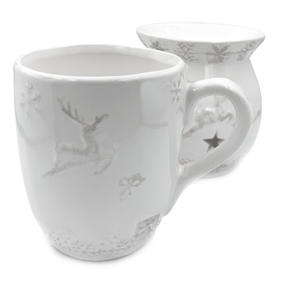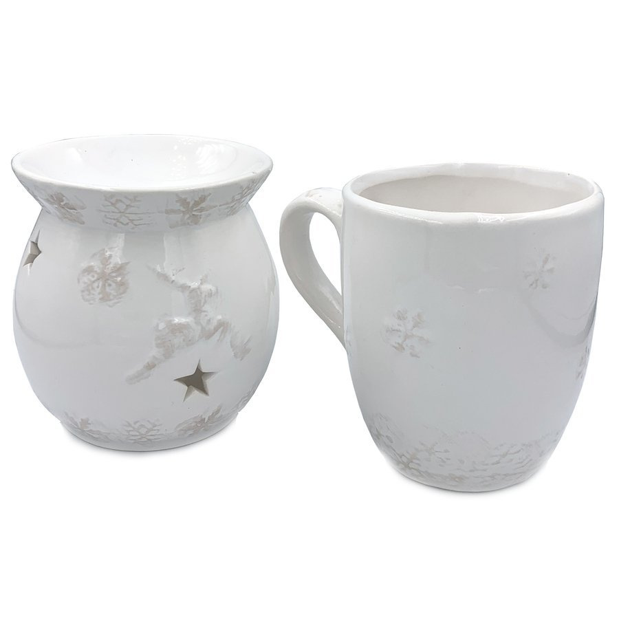 - Ceramiczny komplet z motywem zimowym składający się z kubka oraz lampki zapachowej, do której wstawiamy świeczkę, a do zagłębienia wlewamy wodę z kilkoma kroplami esencji zapachowej. Całość w bardzo ładne świąteczne wzorki w płatki śniegu i renifery.