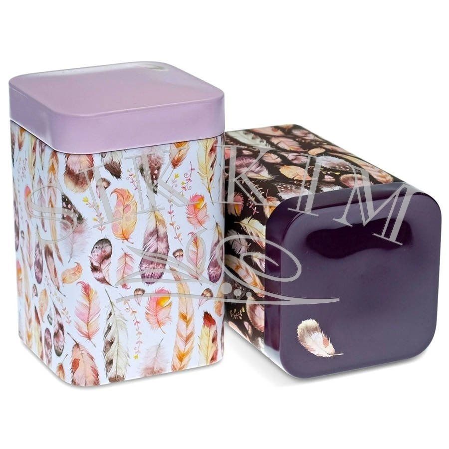 Zestaw dwóch puszek na herbatę, kawę, lub inne sypkie produkty, z barwnym nadrukiem prezentującym kolorowe pióra na jasnym tle na pierwszej, oraz ciemnym tle na drugiej. Ciepłe barwy, pastelowe pokrywki ładnie kontrastują z litografią na bokach. Pojemniki przeznaczone są na 100 gramów, ale pojemność oczywiście zależy od rodzaju przechowywanego produktu. Po zamknięciu wieczko idealnie spasowane jest z powierzchnią boczną, co dodaje elegancji i szyku. Doskonałe wykonanie gwarantowane przez renomowanego europejskiego producenta. Wymiary zewnętrzne puszki ~ 70x70x110mm.