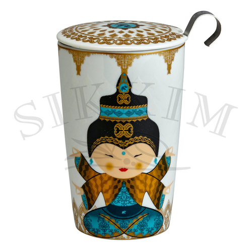 Kubek porcelanowy o podwójnych ściankach będących izolacją termiczną, dzięki której zawartość dłużej będzie trzymać właściwą temperaturę, jednocześnie chroniąc dłoń przed poparzeniem. W środku zmieścimy 350ml naparu, który z łatwością przygotujemy dzięki znajdującemu się w komplecie zaparzaczowi oraz przykrywce. Jako opcję można dokupić specjalną przygrywkę z tworzywa sztucznego, która przekształci kubek w zestaw typu `Tea to Go!`. Przy produkcji naczynia użyto techniki zdobienia pod szkliwem oraz na jego powierzchni, przez co nadruk sprawia wrażenie wielowarstwowego i trójwymiarowego. Doskonały efekt gwarantowany, jednak przy takiej dekoracji nie zaleca się zmywania kubka w zmywarce.