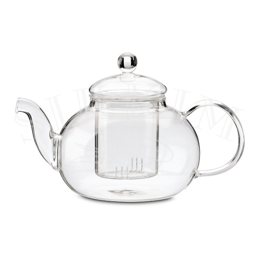 Klasyczny czajniczek o pojemności 750ml, zupełnie gładki i przepięknie prezentujący rozwijające się liście herbaciane wewnątrz, posiada szklany zaparzacz. Niezwykle modny fason, który nigdy nie traci na aktualności. W całości szklane wykonanie. Drobne nacięcia na filarze zatrzymają nawet najdrobniejsze frakcje herbaciane. Całkowita wysokość 14cm, średnica 13cm, długość od dzióbka do rączki to 20cm.
