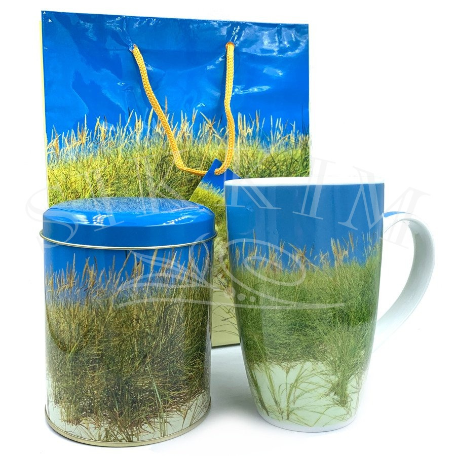 Ciekawy zestaw prezentowy z trzech elementów, gdzie każdy z nich przedstawia wspólny wzór z nadmorskimi wydmami, które porośnięte są wysoką trawą, a nad nimi widać przepiękne błękitne niebo. Okrągła puszka przeznaczona jest na około 125g produktu, wieczko zamykane jest na wcisk. Jej wysokość to ~105mm i średnica 90mm. Kubek wykonany jest z porcelany i omawiany wzór jest naniesiony na cały jego obwód. Wysokość kubka to 125mm. Kupując zestaw otrzymujesz torebkę z lakierowanego papieru i uszami ze sznurka. Jest to nietuzinkowy prezent zarówno dla kobiety, jak i mężczyzny.