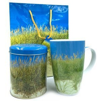 Zestaw składający się z porcelanowego kubka i metalowej puszki na herbatę, który zapakowany jest w papierową torebkę. Całość ma wspólny wzór przedstawiający nadmorskie wydmy zarośnięte trawami, z błękitnym niebem w tle.