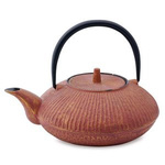 Ciężki i solidny czajnik z żeliwa, wewnątrz emaliowany, sprzedawany wraz z metalowym sitkiem do parzenia herbaty.