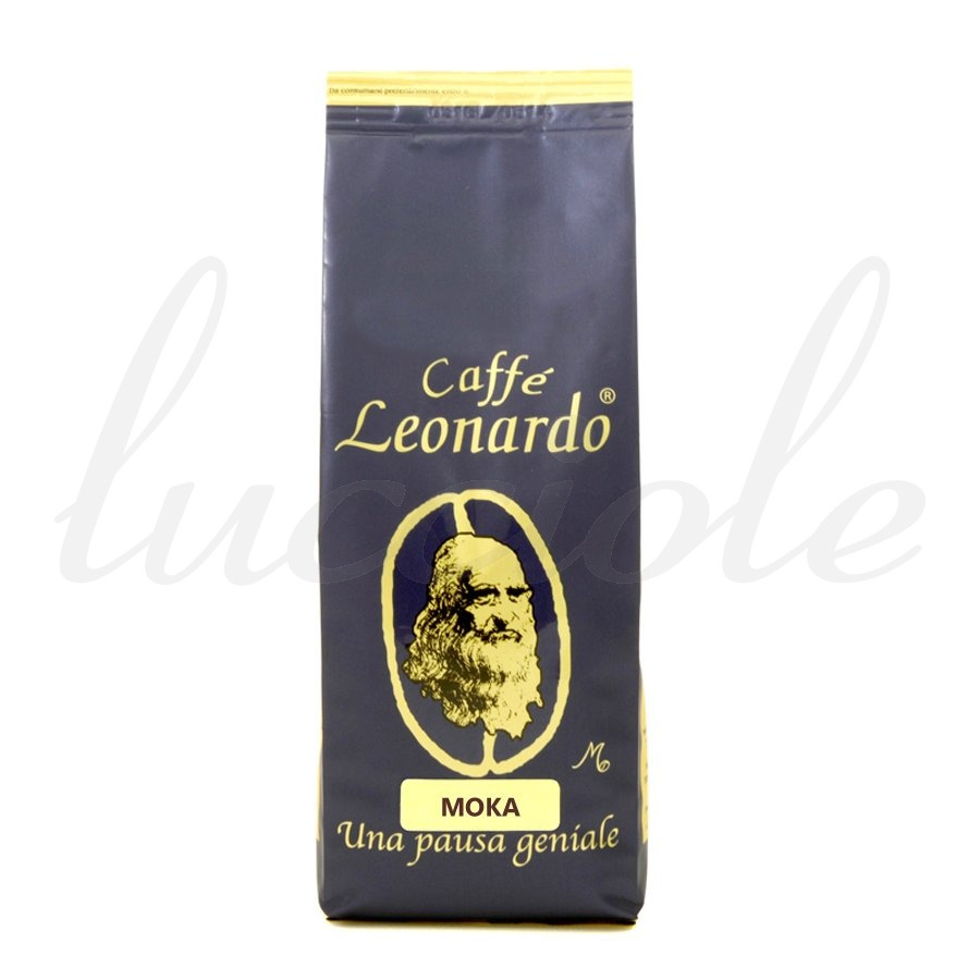 Caffe Leonardo to esencja włoskiego espresso, filiżanka pełna aromatów i toskańskiego słońca, `Una Pausa Geniale` jak mawiają Włosi oddając się typowemu dla tego regionu słodkiemu `nic-nierobieniu` czyli Dolce Farniente. Niebieska paczka kawy Leonardo `Aroma Intenso` to starannie dobrana mieszanka ziaren z sita o kalibrze 18, gdzie 80% stanowi kompozycja Arabica idealnie równoważąca moc i szorstkość 20% Robusty. Napar ma bardzo intensywny aromat i pobudzające działanie, rekomendowana jest do kawiarni lub restauracji. Kawa została firmowo zmielona do parzenia w kafetierkach Moka stawianych na gaz, french-press`ach lub filtrach papierowych i oferowana jest w paczce 250g.
