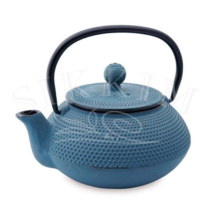 Bardzo ładny, oryginalny żeliwny czajnik o pojemności 700ml w intensywnie niebieskim kolorze. Masywny i długo utrzymujący ciepło, do tego trwały i nadający profesjonalnego szlifu każdej ceremonii herbacianej. Dla łatwiejszego utrzymania w czystości od środka pokryty emalią, wyposażony również w sitko do parzenia wykonane z nierdzewnej stali. Wysokość czajnika bez rączki to 12cm, razem z rączką to 15cm, maksymalna szerokość 17cm i średnica sitka 8cm.
