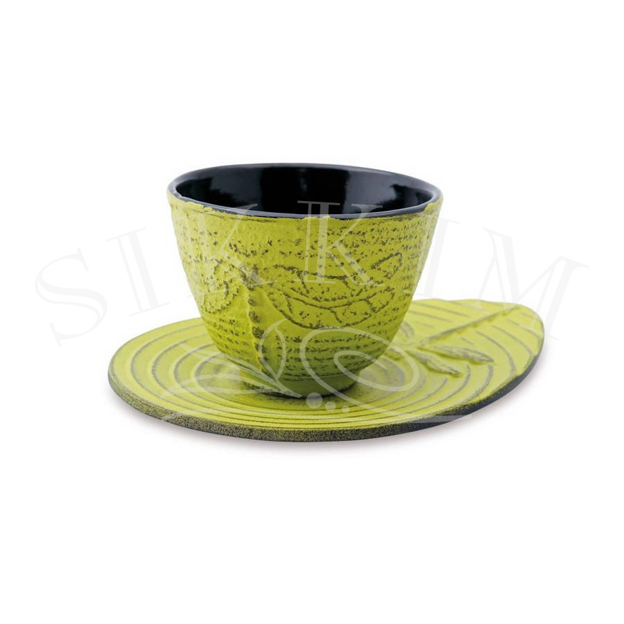 Żeliwna czarka o pojemności 100ml wspaniale współgrająca ze stylistyką czajników żeliwnych z identycznym motywem ważki na bokach, wewnątrz emaliowana, sprzedawana wraz z podstawką. Wysokość czarki to 5,5cm, jej średnica to 7,5cm. Wymiary owalnego spodka to 10,5x13,5cm.