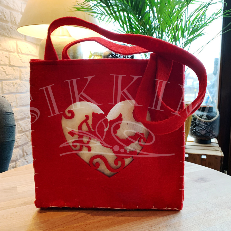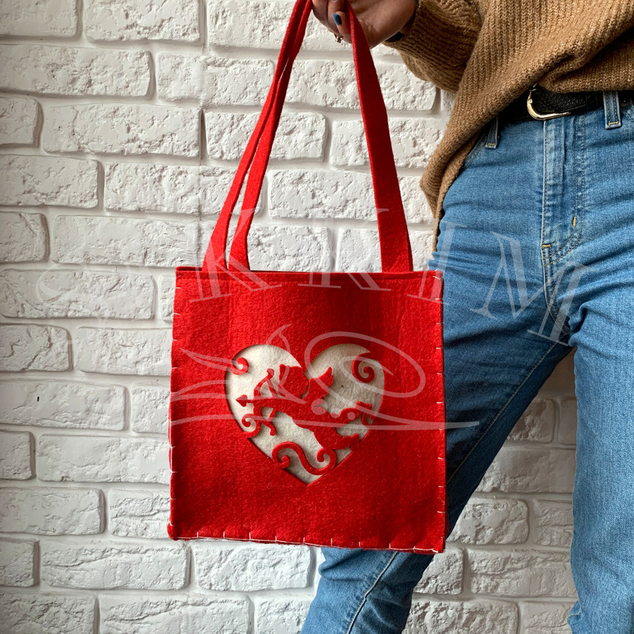 - Czerwona torebka wykonana z naturalnego filcu z wyciętym ornamentowym wzorem Amora. Ciekawy dodatek do prezentu walentynkowego lub przy każdej innej okazji, kiedy obdarowujemy bliską nam osobę.