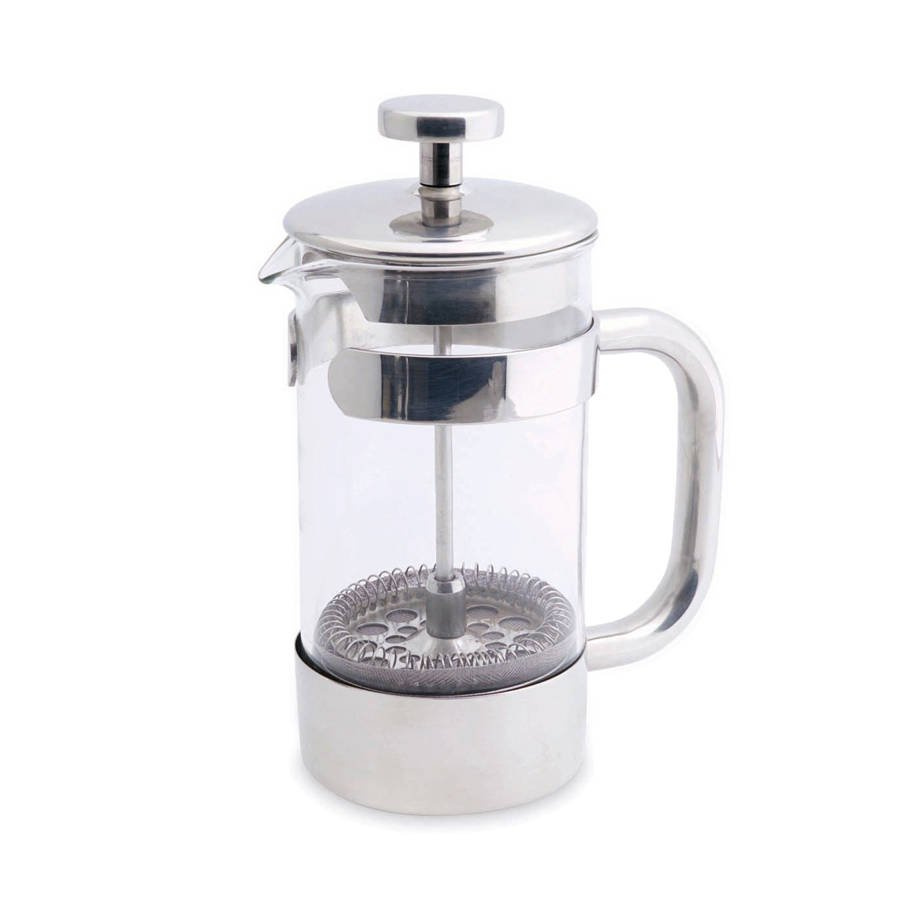 Solidny szklany dzbanek o pojemności 1 litra, w uchwycie ze stali nierdzewnej, do przygotowywania kawy lub herbaty. Do pojemnika wsypujemy odpowiednio zmieloną kawę (należy ustawić mielenie na French Press) lub liście herbaciane, a po wymaganym czasie parzenia wciskamy tłok, przez co sitko oddziela napar od fusów.