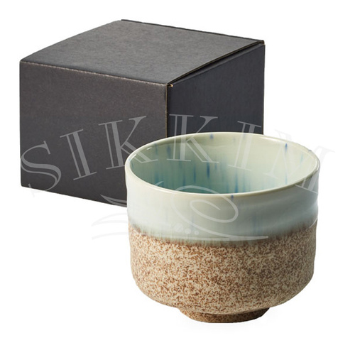 Doskonałej jakości, w całości ręcznie wykonana japońska czarka 'Chawan' do ceremonialnej herbaty Matcha. Naczynie jest stosunkowo niewielkich rozmiarów, a równoległe do siebie ścianki nadają jej unikalnej formy. Dolna część zewnętrznej powiechni nie jest szkliwiona i ma strukturę chropowatego kamienia. Od wewnątrz czarka ma błękitno zielonkawą powłoką z drobne cętki i jest całkowicie gładka. Średnica to 10,5cm, a całkowita wysokość to 8cm, przy napełnieniu po brzegi pojemność będzie wynosiła 400ml, jednakże przygotowując herbatę należy przyjąć pojemność około 150ml. Każda sztuka ma unikalny charakter i wykończenie, jak to bywa przy rzemieślniczej produkcji.