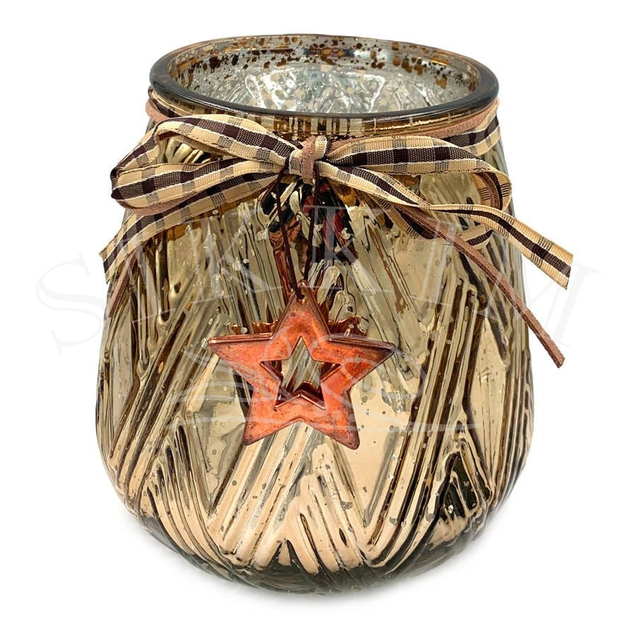 Przepiękny lampion wykonany z cienkiego szkła, częściowo metalizowany od wewnątrz, przez co delikatnie przeświecający. Wspaniale nadaje się na elegancki prezent, stanowi przepiękną dekorację w domu w okresie świąt. Lampion jest w kolorze starego złota oraz posiada dekorację z tasiemek i ceramicznej ozdoby w kształcie gwiazdki. Wymiary świecznika to 13cm średnicy w najszerszym miejscu oraz wysokość 14cm.
