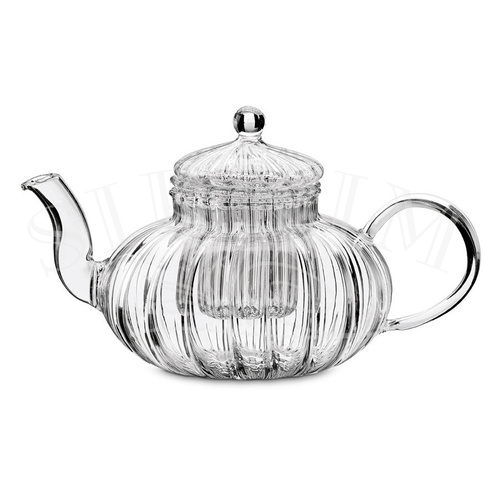 - Przepiękny szklany czajniczek o klasycznej formie, z przepięknymi przetłoczeniami na bokach i szklanym zaparzaczem.