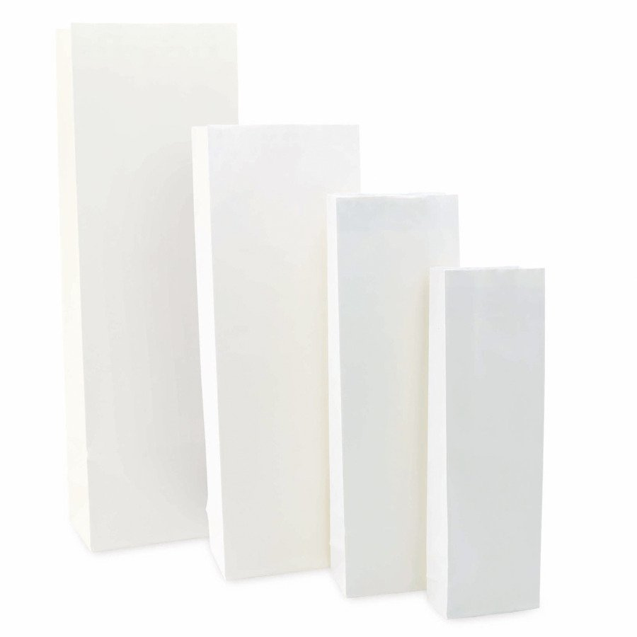 Torebki do pakowania produktów sypkich, trójwarstwowe, wnętrze białe, na zewnątrz z matowego satynowanego papieru, dno blokowe, sprzedawana w większych opakowaniach zbiorczych. Wymiary ~ 105x65x330mm.