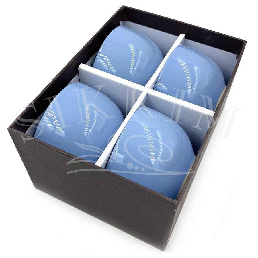 Komplet czterech porcelanowych czarek w kolorze niebiesko - błękitnym, pakowanych w ładne tekturowe pudełko. Idealnie spiszą się jako uzupełnienie zestawu herbacianego, do żeliwnych czajników lub innych zestawów porcelanowych. Wymiary 75mm średnicy oraz 60mm wysokości dają pojemność około 150 ml.