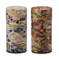 Japońskie puszki oklejane tkaniną, sprzedawane w komplecie dwóch sztuk w kolorze czerwonym i czarnym, wymiary to 75mm średnicy i 153mm wysokości.