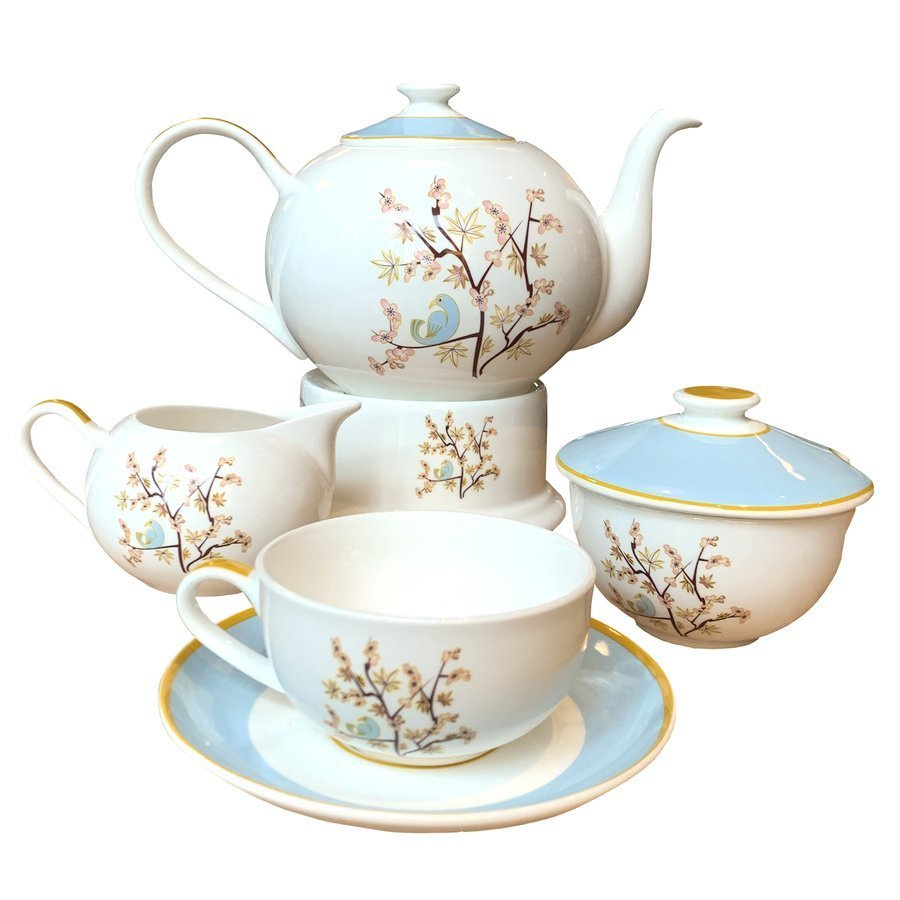 Doskonałej jakości porcelanowy zestaw sygnowany logo niemieckiego producenta składający się z czajnika o pojemności 1400ml, czterech filiżanek 180ml wraz ze spodkami oraz cukiernicy z mlecznikiem. Komplet dekorowany jest we wrór `Michiko` z dekoracją w gałązki kwitnącej wiśni w delikatnych pastelowych kolorach. Porcelana jest cienka i lekka, a szkliwienie wysokiej jakości gwarantujące długie użytkowanie. (Uwaga - zestaw bez podgrzewacza na świeczkę widocznego na zdjęciu, element wyprzedany).