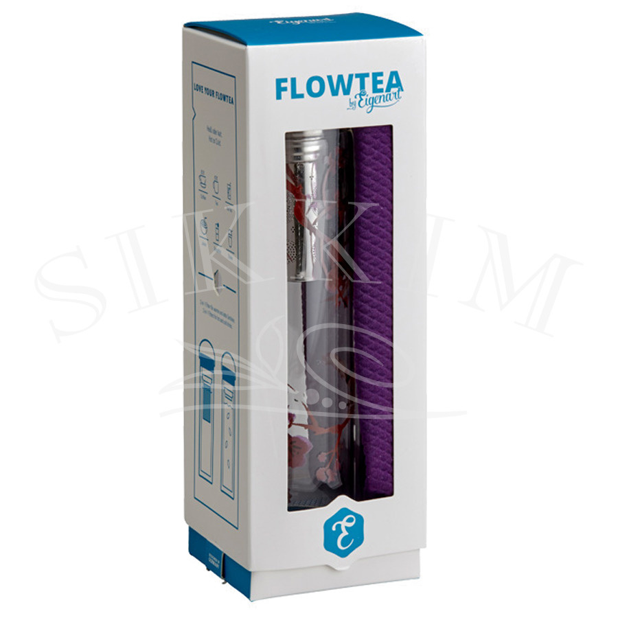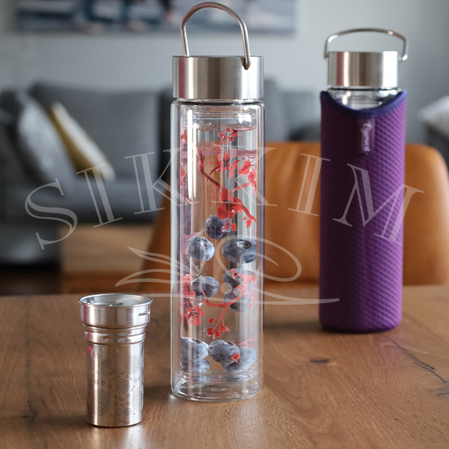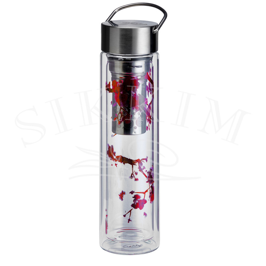 - Szklana dwupłaszczyznowa butelka do zaparzania herbaty lub po prostu na wodę, z piękną dekoracją umieszczoną na wewnętrznej warstwie, sprzedawana z neoprenowym ocieplaczem.