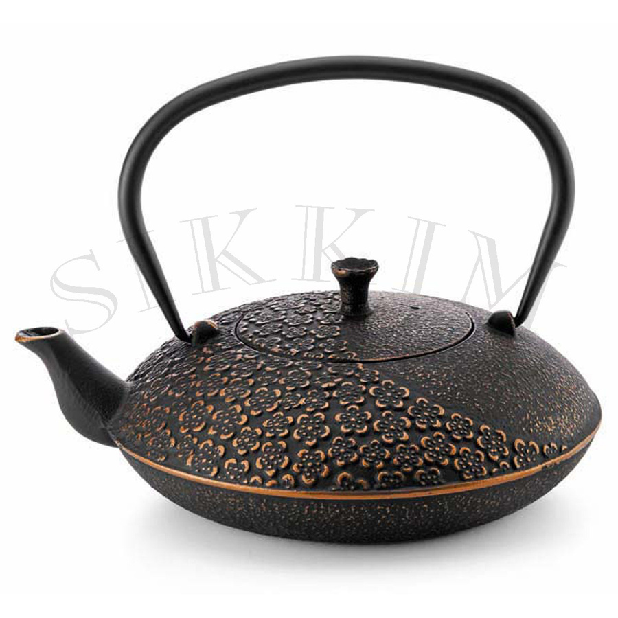 Spory, bo o pojemności 1100ml, żeliwny czajnik o przepięknej formie w kształcie mocno spłaszczonego dysku, z wytłoczoną dekoracją przedstawiającą Sakurę - kwitnącą wiśnię. Kolorystyka to matowa czerń i stara miedź. Doskonale prezentuje się w każdym wnętrzu i nadające profesjonalnego szlifu ceremonii herbacianej. Niezwykle trwały, będzie służył latami, jak i dekorował wnętrze mieszkania. Jego wnętrze pokryte jest emalią dla łatwiejszego utrzymania czystości, wyposażony jest również w sitko do parzenia wykonane z nierdzewnej stali. Wysokość czajnika bez rączki to 00cm, razem z rączką 21cm, szerokość 00cm, a średnica otworu pod sitko to 0cm. Waga samego czajnika bez naparu to 0kg.
