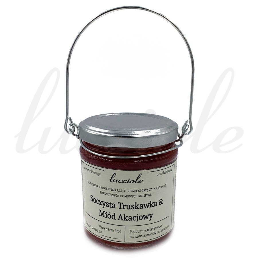 Domowe przetwory na bazie miodów, przygotowane przez Gospodarstwo Agroturystyczne z Toskanii według tradycyjnych rodzinnych receptur. W słoiczku znajdziesz prawdziwą `Confetture Artigianale` zrobioną wyłącznie z włoskich truskawek i naturalnego miodu akacjowego. Prawdziwi Włosi używają również konfitur oraz miodów jako dodatków do twardych i dojrzewających serów i wędlin. Skład: truskawki 55%, naturalny miód, pektyny owocowe, kwasek cytrynowy.