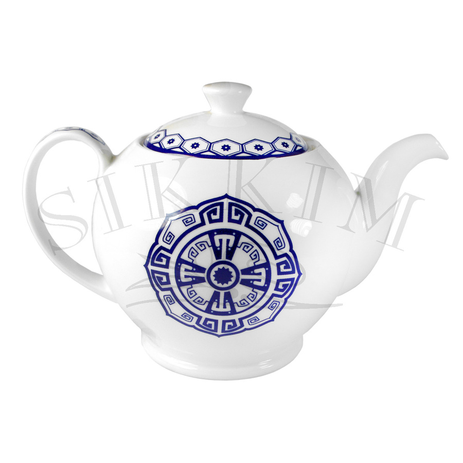 Doskonałej jakości porcelanowy zestaw sygnowany logo niemieckiego producenta `Cliffield Hamburg` składający się z czajnika 1500ml umieszczanego na dopasowanym podgrzewaczu na świeczkę typu tea-light Wysokiej jakości porcelana o doskonałej bieli, twarde i trwałe szkliwo gwarantujące długą żywotność i odporność na zużywanie, wszystkie elementy nadające się do zmywania w zmywarkach. Dekoracja przedstawia jednokolorową grafikę przypominającą różę wiatrów. Wysokość czajnika z przykrywką to 145mm, szerokość od rączki do dzióbka 240mm. Średnica podgrzewacza 140mm, wysokość 65mm.