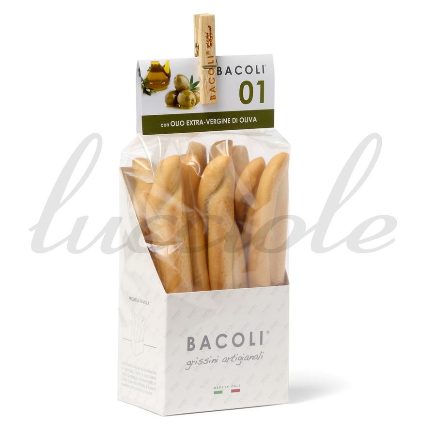 Doskonałej jakości Grissini Artigianali, których delikatna struktura i kruchość dosłownie uzależnia. Włoska klasyka spod ręki mistrzyni cukiernictwa Marty Maristrello, która doprowadziła codzienne przepisy do doskonałości. Oferowane grissini są niebagatelnej grubości, dlatego nazwano je 'Bacoli' od starodawnej nazwy biskupiego kija pasterskiego (baculum - łac.). W tej wersji najbardziej naturalne - po prostu z oliwą z oliwek z pierwszego tłoczenia, wspaniałe jako dodatek do deski serów lub wędlin, popołudniowego aperitivo owinięte plasterkiem szynki parmeńskiej lub salami z Mediolanu. Opakowanie ma kartonowy ekspozytor oraz wewnętrzny rękaw foliowy, który powoduje, że Bacoli są gotowe do eleganckiego serwowania bez przekładania w inne naczynie. Same naturalne składniki: mąka pszenna typu "0", woda, oliwa z oliwek z pierwszego tłoczenia 4%, sól, cukier, drożdże.