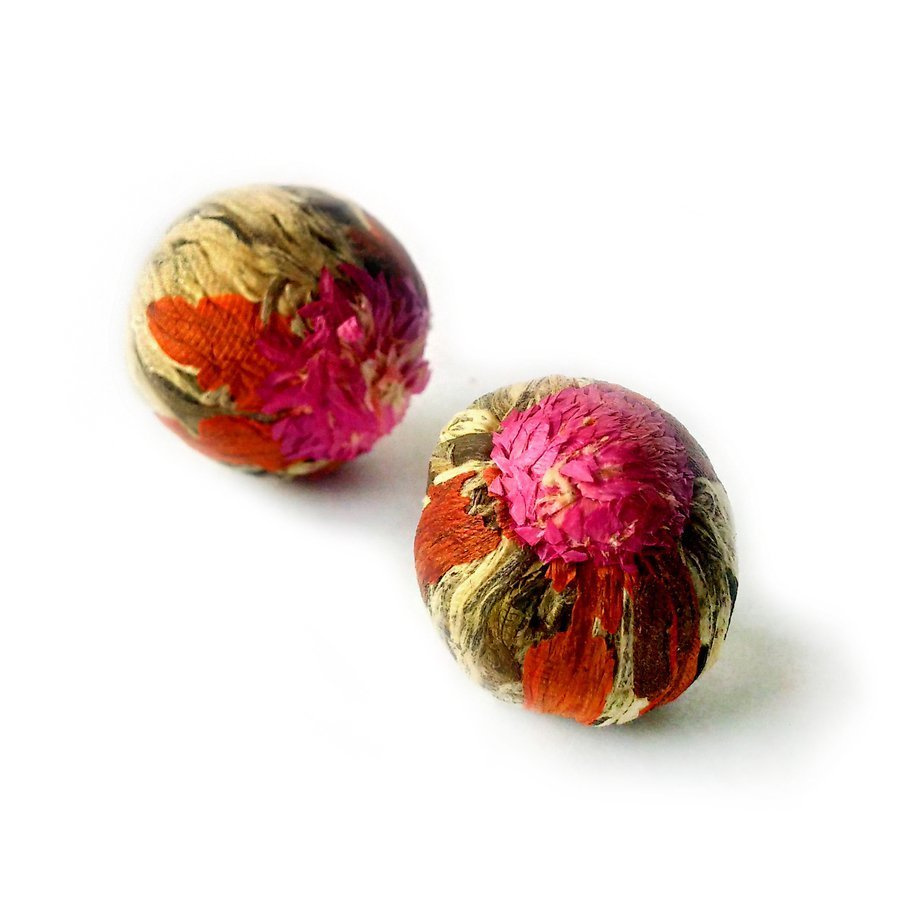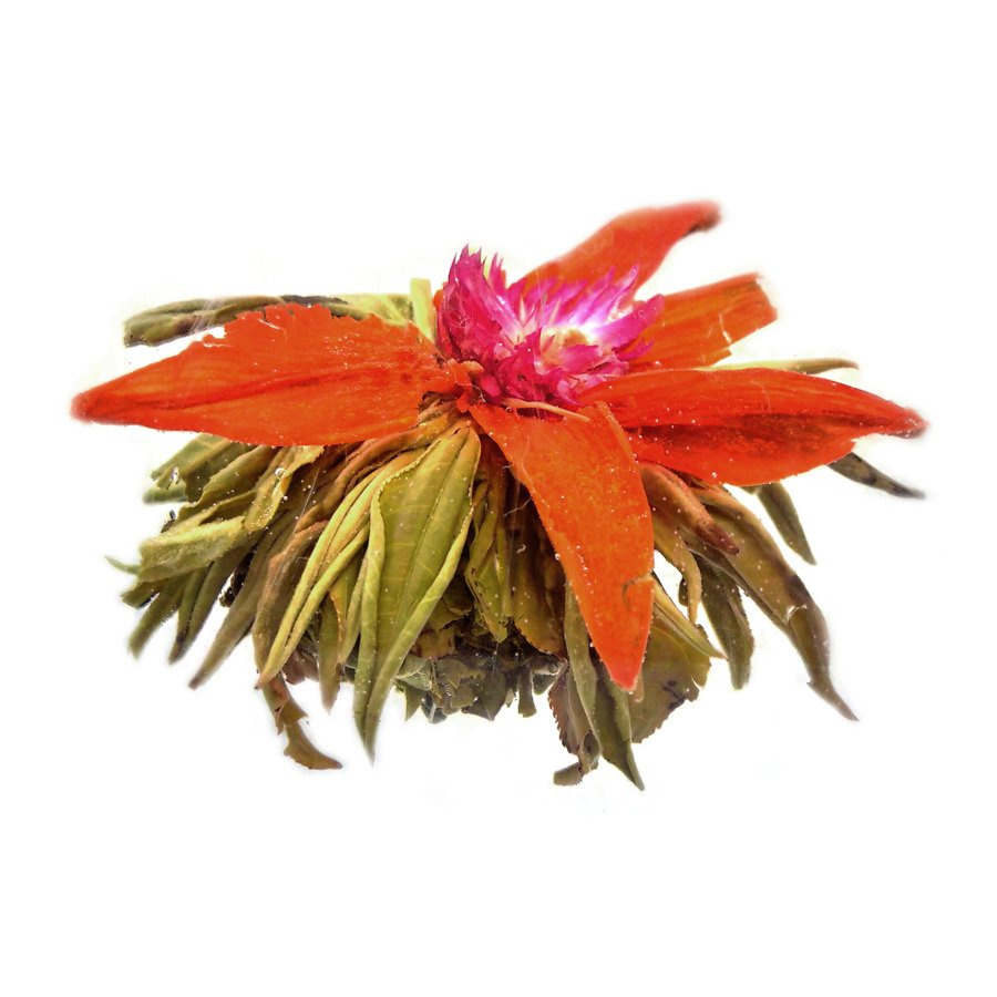 Młode, duże liście herbacianego krzewu ręcznie zwijane wraz z pomarańczowym kwiatem nagietka i purpurowym kwiatem amarantusa. Po zalaniu gorącą wodą listki przepięknie rozwijają się, a kulka zmienia się w zachwycający i dekoracyjny kwiat. Herbata kwitnąca posiada delikatny kwiatowy aromat i orzeźwiający smak. Kulkę można zaparzać kilkakrotnie, a z uwagi na przepiękny wygląd zalecamy parzyć ją w przezroczystym naczyniu.