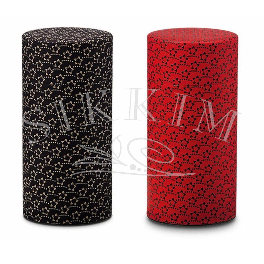 • Japońskie puszki oklejane tkaniną, sprzedawane w komplecie dwóch sztuk w kolorze czerwonym i czarnym, wymiary to 75mm średnicy i 153mm wysokości.