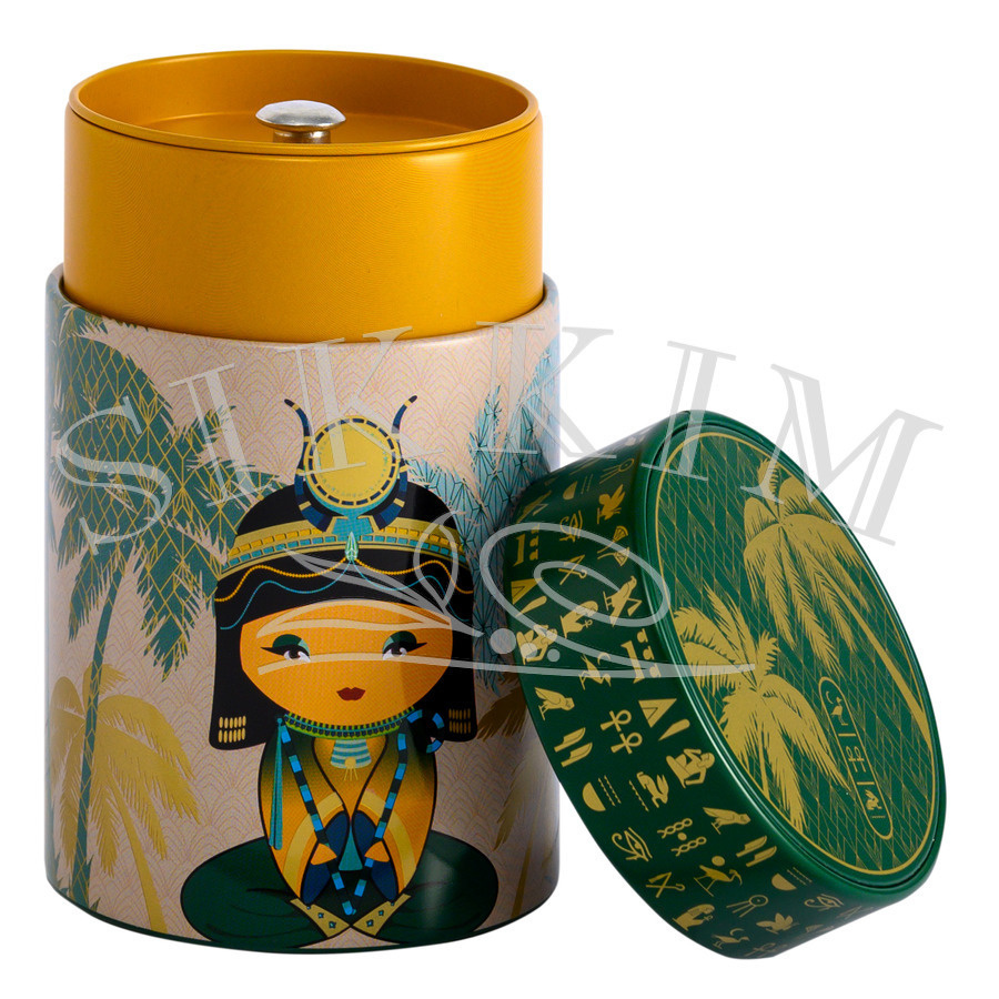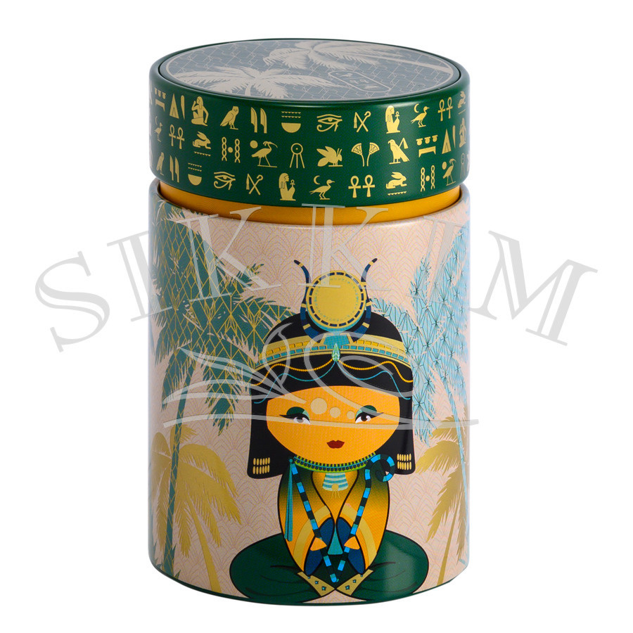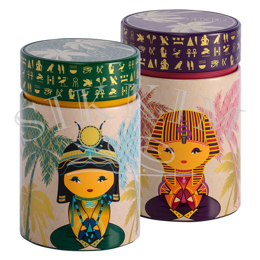 Zestaw 2 czarujących puszek na herbatę, kawę lub inne sypkie produkty, przestawiające postaci przeprane za egipskiego Sfinksa oraz małą Egipcjankę na pastelowym tle palm. Przykrywka zdobiona jest również złotymi i wypukłymi emblematami z obrazkowego alfabetu egipskiego. Wewnątrz znajdziesz dodatkowe zamknięcie podnoszące walory estetyczne oraz szczelność pojemników. Dedykowane są na 150g produktu, ale oczywiście waga zależy o rodzaju produktu, który wsypiesz. Wciskane wieczko jest idealnie spasowane z powierzchnią boczną pojemniczka, jednak pozostawiają mały rant wgłębienia na obwodzie.Doskonałe wykonanie gwarantowane przez renomowanego europejskiego producenta. Wymiary zewnętrzne puszki ~ 75mm średnicy i 117mm wysokości.