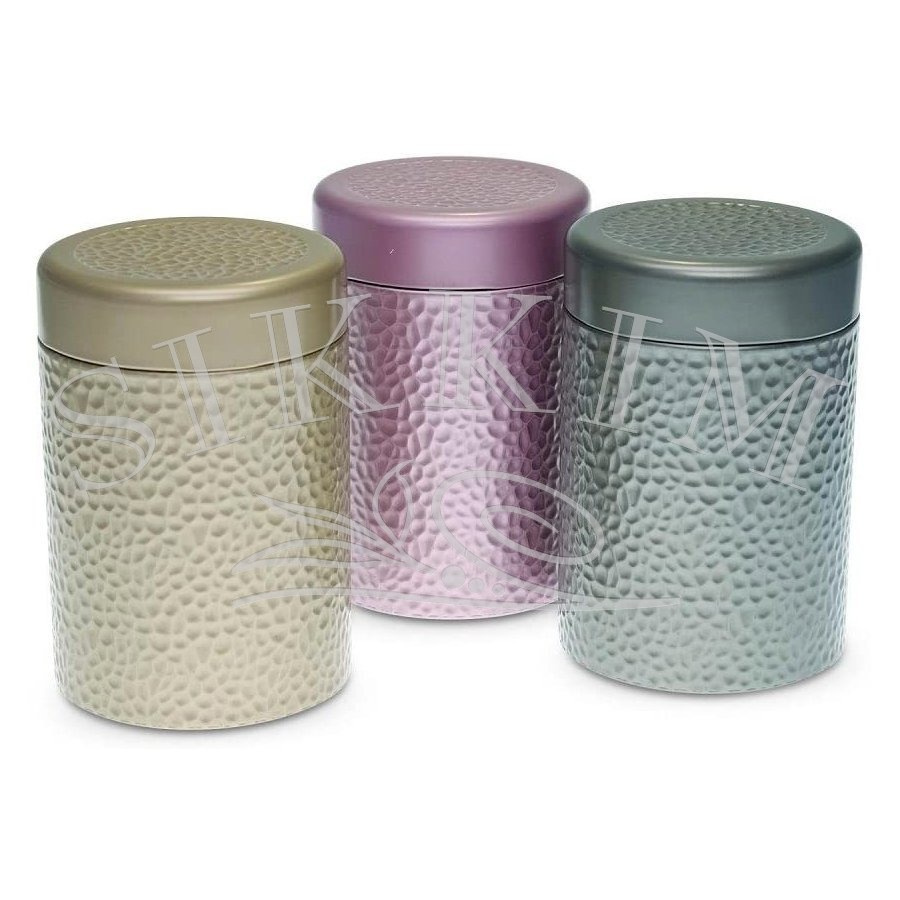 - Nietuzinkowe puszki oferowane w zestawie 3 sztuk, z jednolitym metalicznym nadrukiem i powierzchnią z małymi zagłębieniami jak w efekcie młotkowania. Doskonałe wykonanie gwarantowane przez europejskiego producenta.