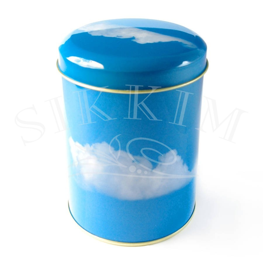 Puszka okrągła na około 125g herbaty z wieczkiem zamykanym na wcisk. Grafika przedstawia chmurkę na błękitnym tle. Opakowanie wykonane jest z metalu, o wymiarach zewnętrznych 90mm średnicy i 105mm wysokości.