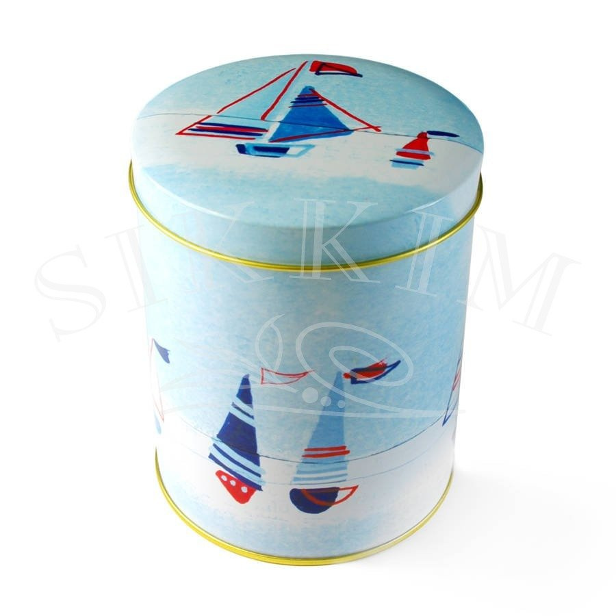 - Puszka okrągła na około 125g herbaty z wieczkiem zamykanym na wcisk. Litografia przedstawia małą, ręcznie rysowaną żaglówkę na błękitnym tle.